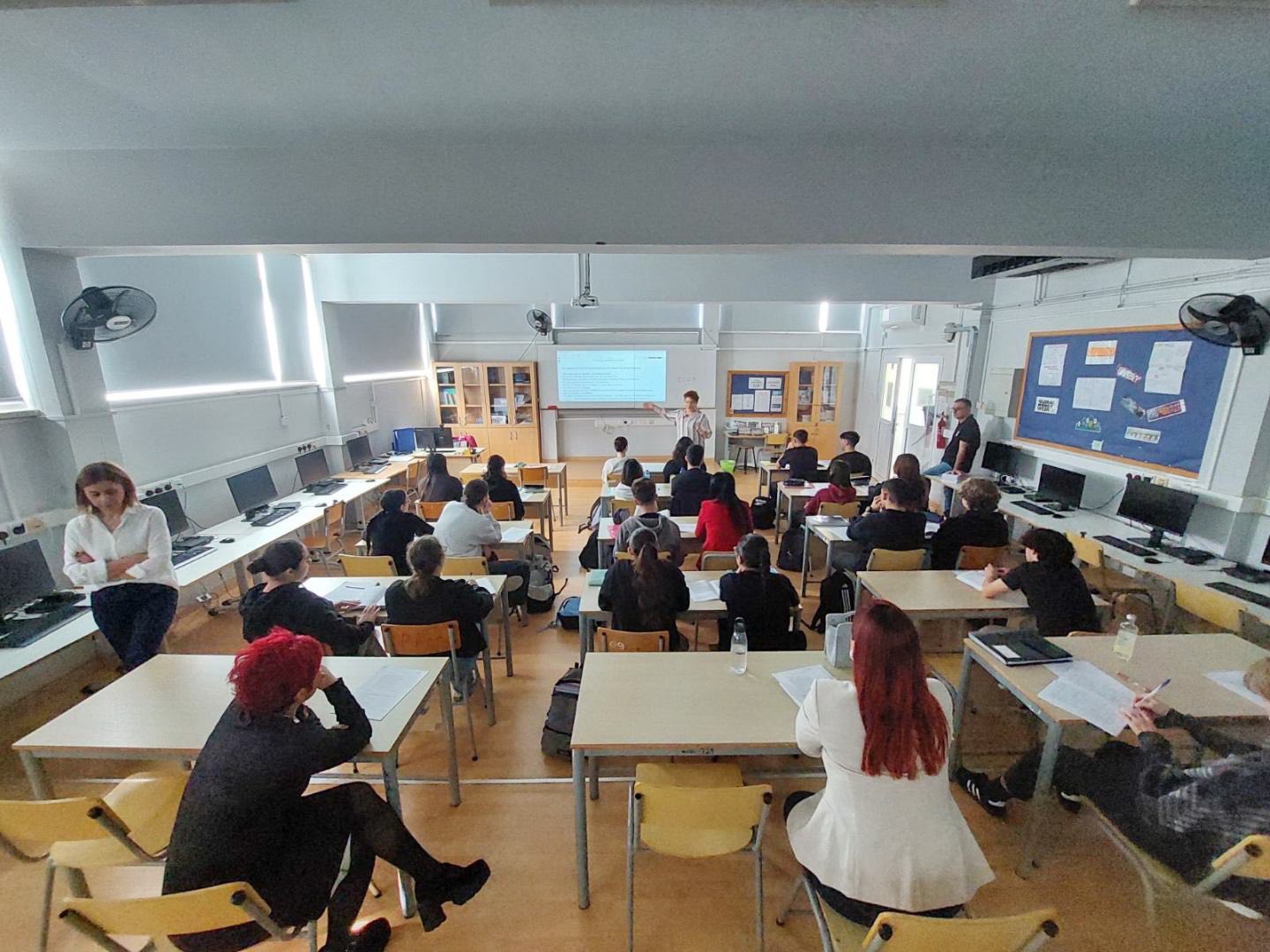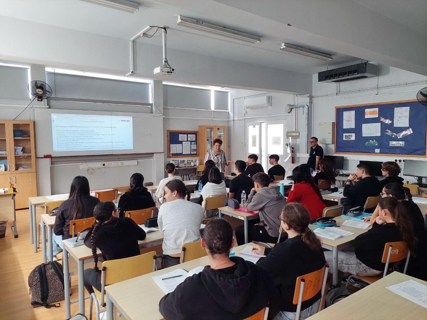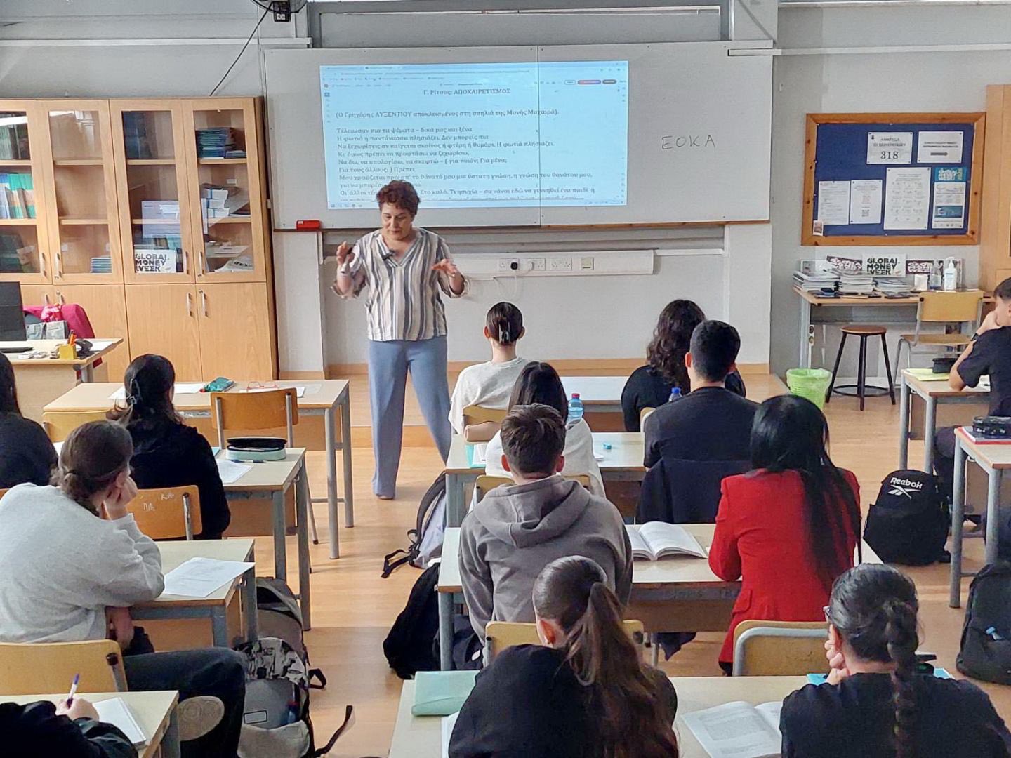 Την Πέμπτη 20 Νοεμβρίου 2025 το σχολείο μας φιλοξένησε τη Δρα Αφροδίτη Αθανασοπούλου, Αναπληρώτρια Καθηγήτρια στο Πανεπιστήμιο Κύπρου, κατόπιν πρόσκλησης της Ομάδας των Φιλολόγων. Η κ. Αθανασοπούλου δίδαξε στη Γ΄ Λυκείου «Τον Αποχαιρετισμό» του Γιάννη Ρίτσου. Μετά το μάθημα, ακολούθησε δημιουργική συνάντηση της κ. Αθανασοπούλου με τους φιλολόγους του σχολείου, κατά την οποία συζητήθηκαν προσεγγίσεις στη διδασκαλία της Λογοτεχνίας και τρόποι διατήρησης ουσιαστικής σχέσης των νέων με το κείμενο.