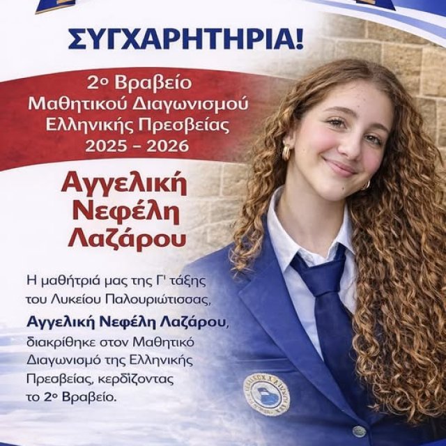 Η Αγγελική Νεφέλη Λαζάρου του Γ31 έλαβε το Δεύτερο Βραβείο στον Μαθητικό Διαγωνισμό Δοκιμίου της Ελληνικής Πρεσβείας 2025-2026.