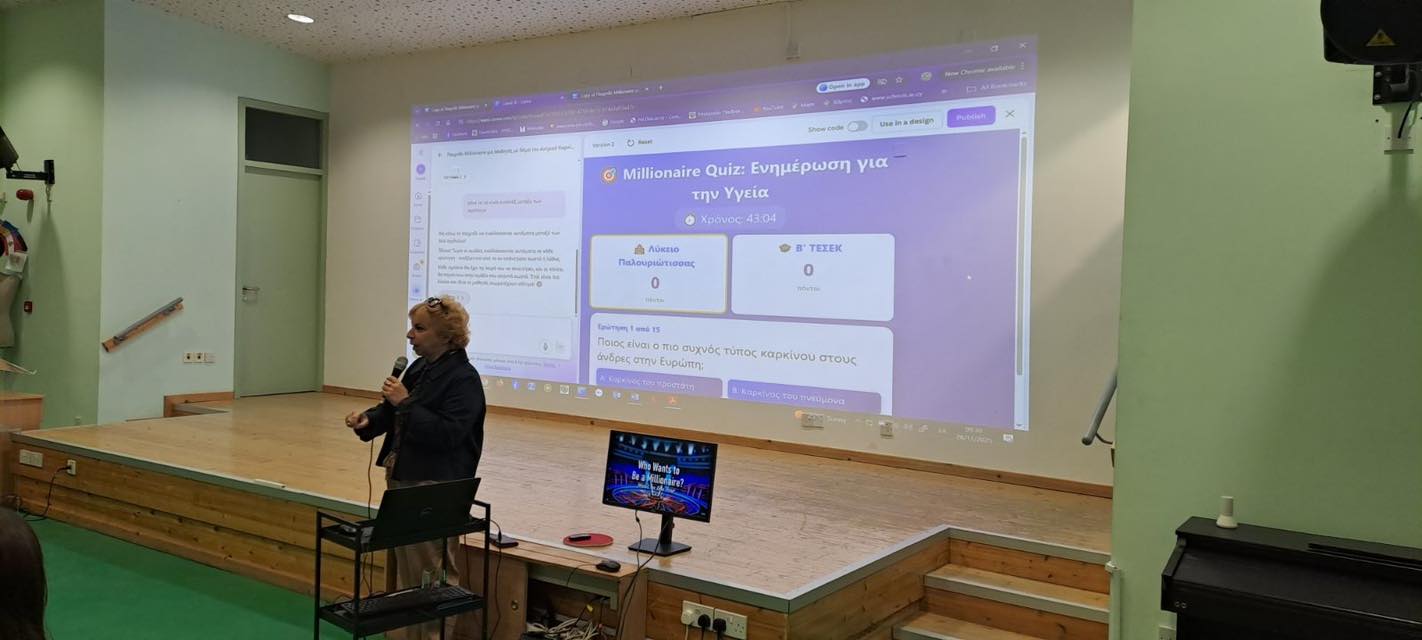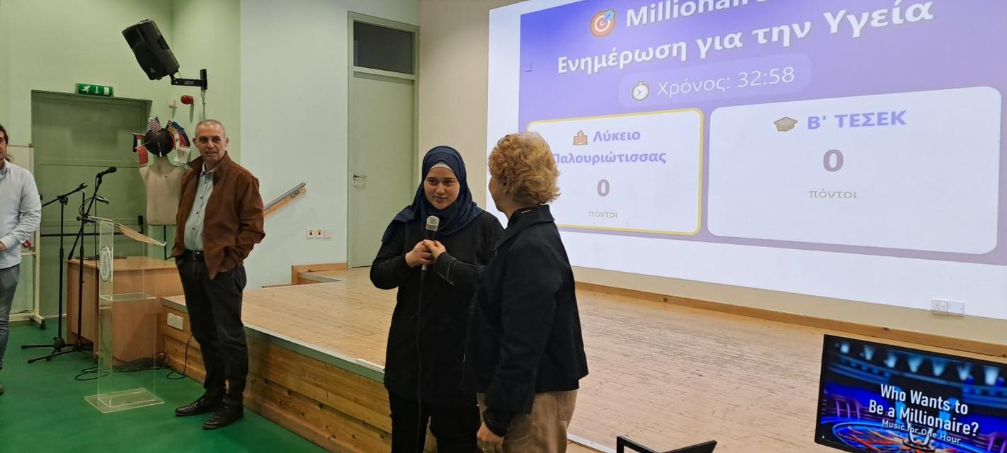 Στις 28 Νοεμβρίου, την 3η π., στην Αίθουσα Προβολών, οι ομάδες του Λυκείο Παλουριώτισσας και της Β΄ ΤΕΣΕΚ Λευκωσίας διαγωνίστηκαν στο παιχνίδι «Εκατομμυριούχος». Το παιχνίδι ήταν αμφίρροπο και κράτησε αμφίρροπο το αποτέλεσμα μέχρι το τέλος. Το παιχνίδι αφορούσε την ανδρική υγεία και την πρόληψη. Συμμετείχαν μαθητές/τριες από τα τμήματα Γ41, Γ51, Γ61.