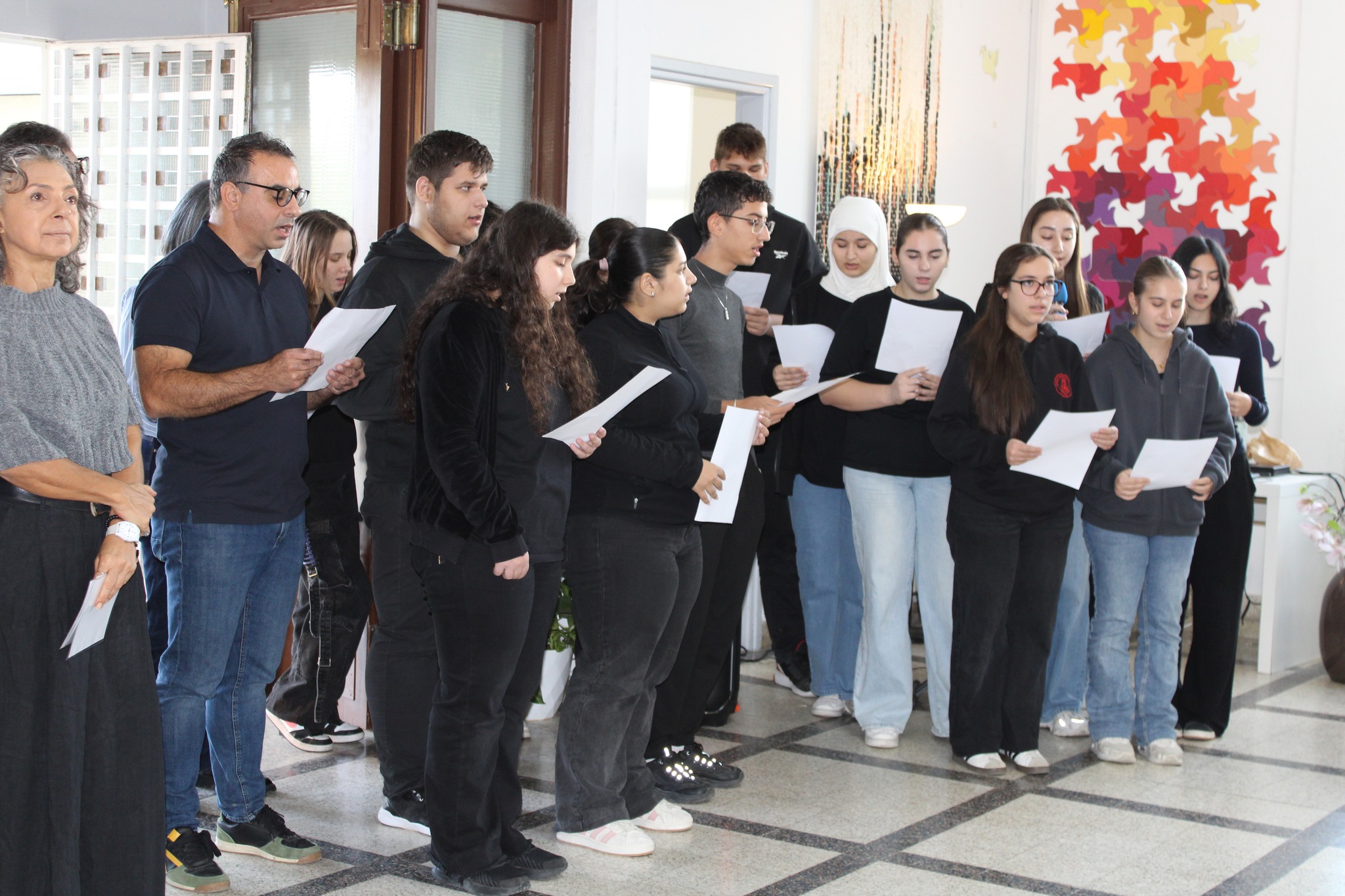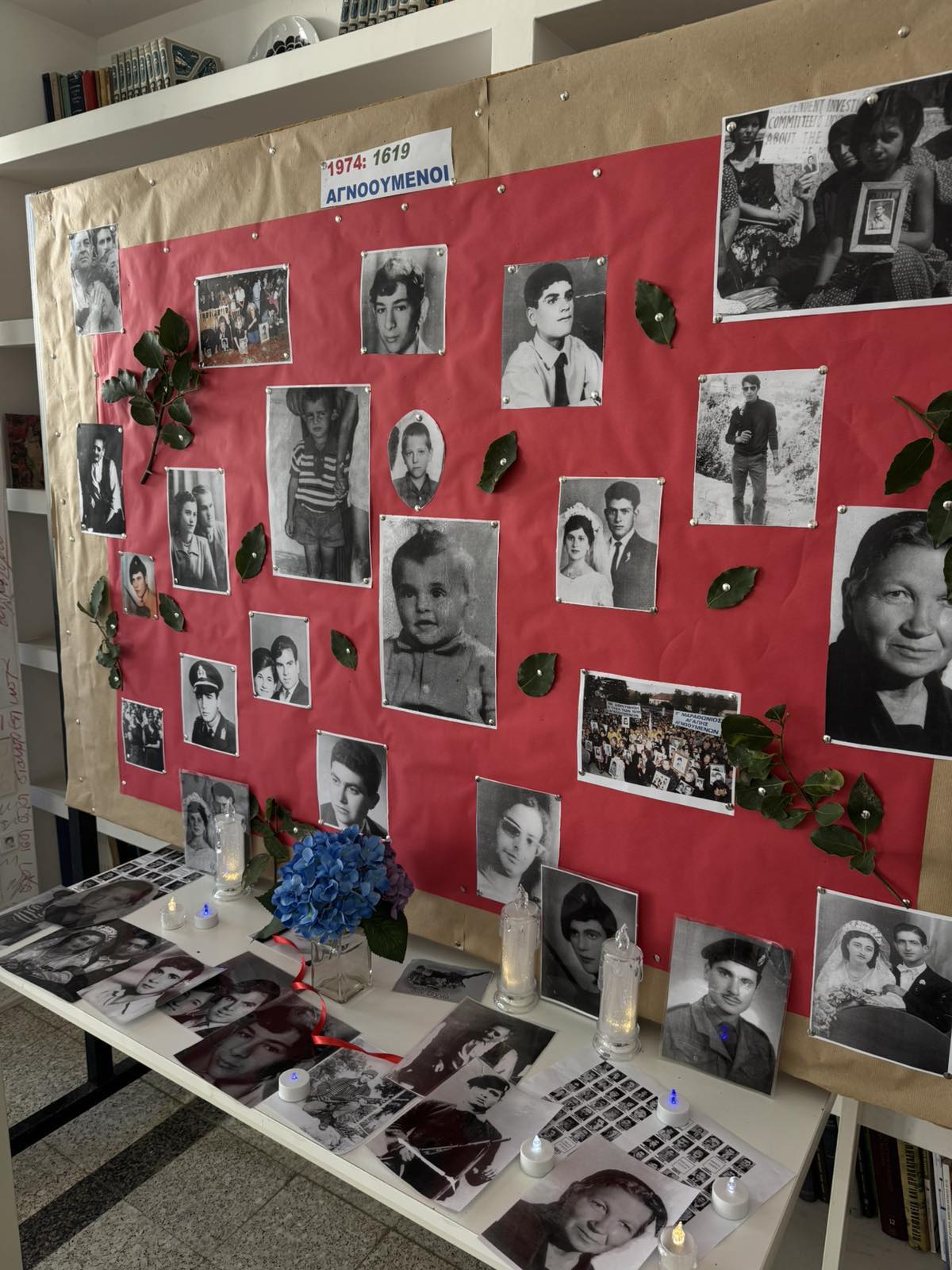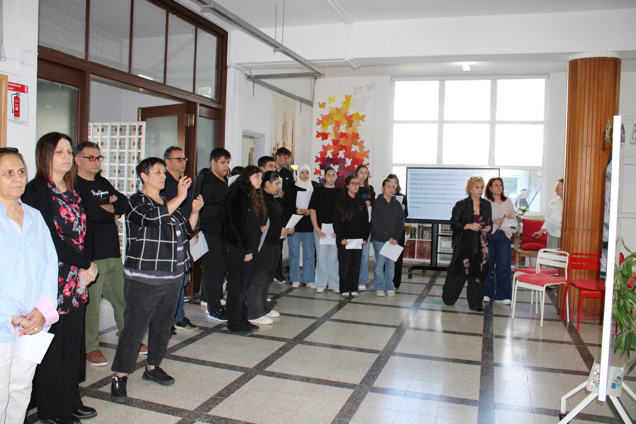Eκδήλωση καταδίκης του ψευδοκράτους πραγματοποιήθηκε στο φουαγέ του σχολείου μας την Παρασκευή, 14 Νοεμβρίου 2025. Λίγο πριν αναχωρήσουν για την αντικατοχική εκδήλωση που διοργάνωσε η ΠΣΕΜ, τα μέλη του Κ.Μ.Σ., οι μαθητές και μαθήτριές μας, καταδίκασαν την ανακήρυξη του ψευδοκράτους με ποιητικά κείμενα, συνθήματα, μουσική και μαρτυρίες για τους αγνοούμενους του 1974. Στον χώρο της εκδήλωσης λειτούργησε πινακίδα-εγκατάσταση με φωτογραφίες και κεριά.