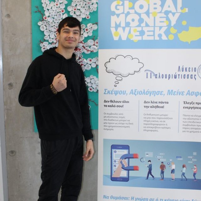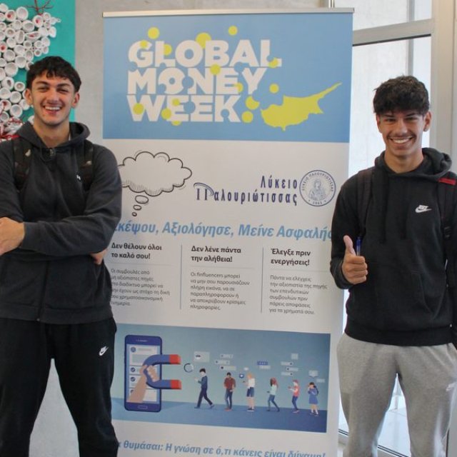Φέτος, για τέταρτη συνεχή χρονιά, γιορτάσαμε στο σχολείο μας την «Παγκόσμια εβδομάδα χρήματος». Στόχος του «Global money week» είναι η ευαισθητοποίηση των νέων σε θέματα, που αφορούν το χρήμα. Συγκεκριμένα επικεντρωθήκαμε στο φετινό θέμα της, που ήταν: «Think before you follow, wise money tomorrow», «Μην ακολουθείς τους άλλους στα τυφλά. Σκέψου έξυπνα, διαχειρίσου τα χρήματά σου σωστά».