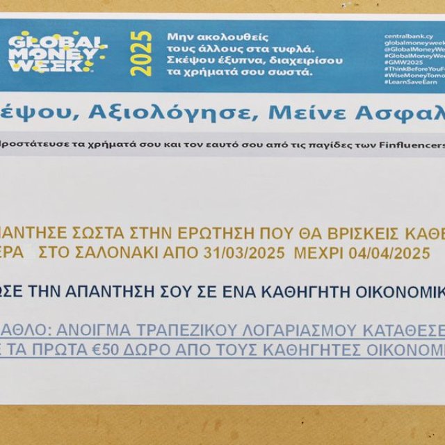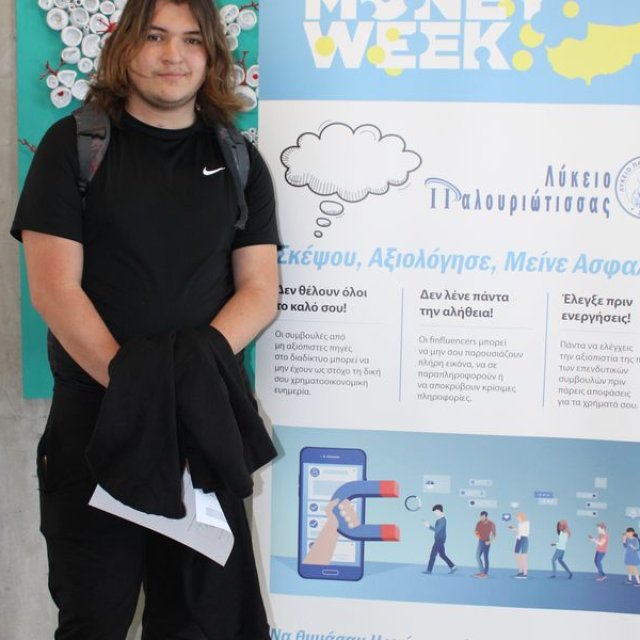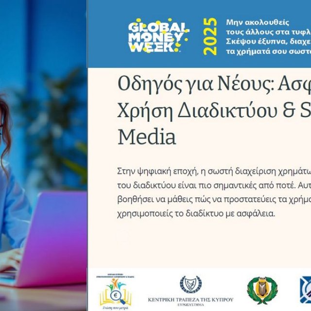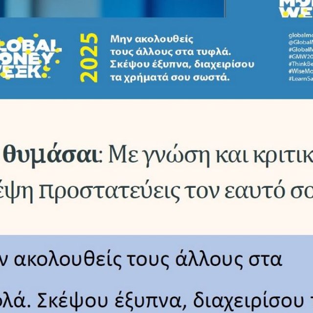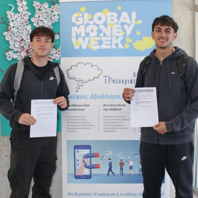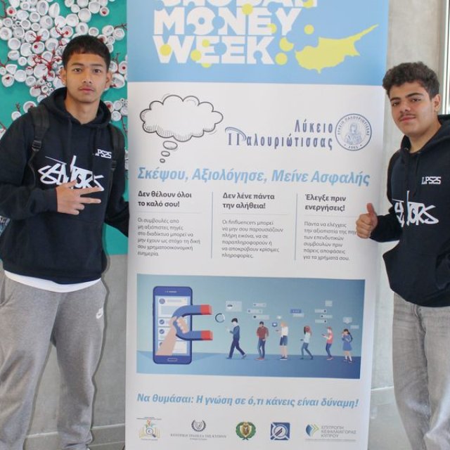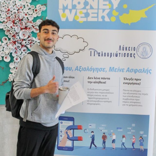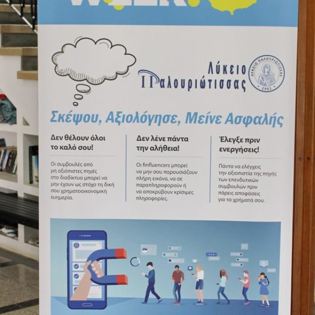 Την Τετάρτη, 3 Απριλίου 2025, έγινε ανάγνωση φυλλαδίου και προβολή μικρής παρουσίασης διάρκειας περίπου δέκα λεπτών (10΄) σε όλα τα τμήματα του σχολείου μας, όπου οι μαθητές/τριες είχαν την ευκαιρία να γνωρίσουν τη σημασία της υιοθέτησης μιας υπεύθυνης και ενημερωμένης προσέγγισης στα προσωπικά οικονομικά, έχοντας επίγνωση των πιθανών κινδύνων στον χρηματοπιστωτικό τομέα και προστατεύοντας τα χρήματα, που κερδίζει κάποιος με κόπο. Το φετινό θέμα της παρουσίασης ήταν Οδηγός για Νέους: Ασφαλής Χρήση Διαδικτύου & Social Media.