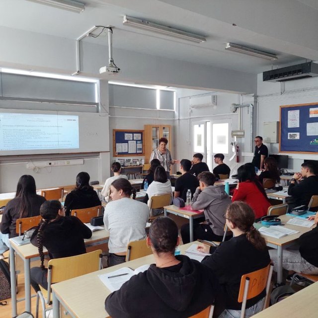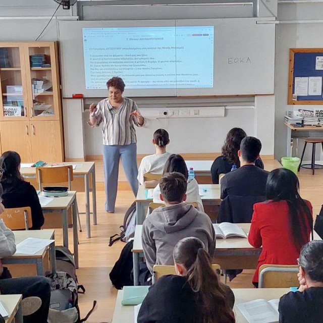 Την Πέμπτη 20 Νοεμβρίου 2025 το σχολείο μας φιλοξένησε τη Δρα Αφροδίτη Αθανασοπούλου, Αναπληρώτρια Καθηγήτρια στο Πανεπιστήμιο Κύπρου, κατόπιν πρόσκλησης της Ομάδας των Φιλολόγων. Η κ. Αθανασοπούλου δίδαξε στη Γ΄ Λυκείου «Τον Αποχαιρετισμό» του Γιάννη Ρίτσου. Μετά το μάθημα, ακολούθησε δημιουργική συνάντηση της κ. Αθανασοπούλου με τους φιλολόγους του σχολείου, κατά την οποία συζητήθηκαν προσεγγίσεις στη διδασκαλία της Λογοτεχνίας και τρόποι διατήρησης ουσιαστικής σχέσης των νέων με το κείμενο.