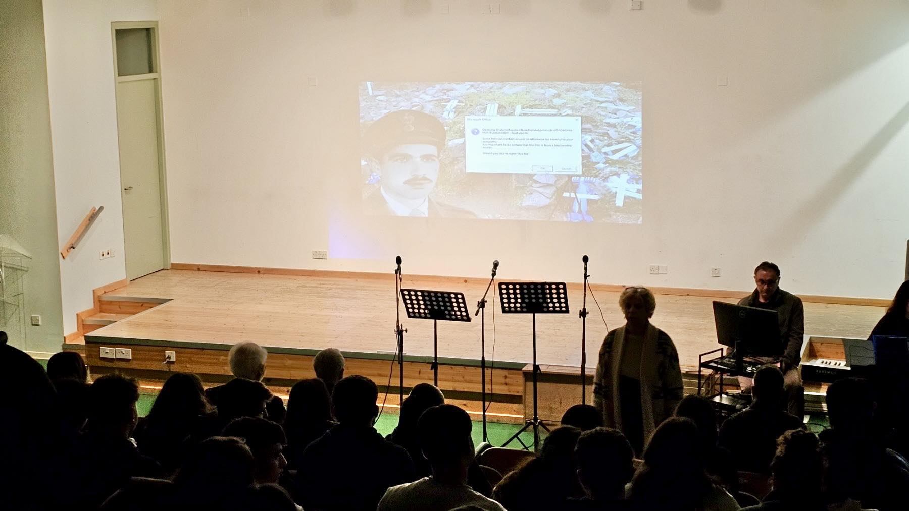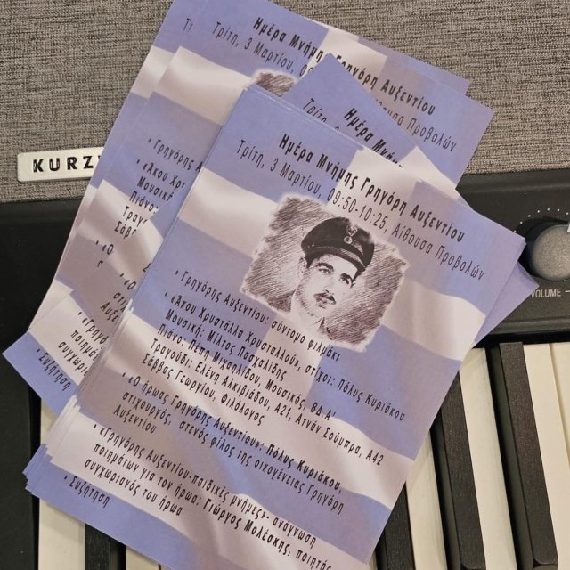 Εκδήλωση στη Μνήμη του ήρωα Γρηγόρη Αυξεντίου πραγματοποιήθηκε την Τρίτη, 3 Μαρτίου, στην Αίθουσα Προβολών. Για τις παιδικές του μνήμες και τα βιώματά του από τον ήρωα μίλησε ο συγχωριανός του, ποιητής, Γιώργος Μολέσκης. Ο Γιώργος Μολέσκης απάγγειλε την ποιητική του σύνθεση Φλεγόμενη Βάτος, η οποία είναι αφιερωμένη στον Γρηγόρη Αυξεντίου. Ο στιχουργός Πόλυς Κυριάκου, στενός φίλος της οικογένειας του ήρωα, μίλησε για τη θυσία του και το νόημά της. Ομάδα μαθητών και ο Φιλόλογος Σάββας Γεωργίου τραγούδησαν το τραγούδι «Άκου Χρυστάλλα» σε στίχους Πόλυ Κυριάκου και μουσική Μίλτου Πασχαλίδη. Η Β.Δ. Α΄Πέπη Μιχηλίδου έπαιξε στο πιάνο τη μουσική. Οι στίχοι του τραγουδιού αναφέρονται στην αδελφή του ήρωα που έφυγε από τη ζωή πριν μερικά χρόνια. Την εκδήλωση παρακολούθησαν τα τμήματα της Γ΄τάξης. Για τις υπόλοιπες τάξεις πραγματοποιήθηκε ενδοτμηματική εκδήλωση αφιερωμένη στον Γρηγόρη Αυξεντίου με υλικό που ετοίμασε η Φιλόλογος Γιόλα Χατζηκώστα.