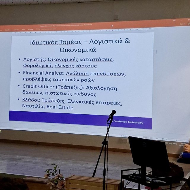 Στο πλαίσιο του Επαγγελματικού Προσανατολισμού, την Τετάρτη, 25 Φεβρουαρίου, πραγματοποιήθηκε σειρά διαλέξεων στο σχολείο μας. Οι ακαδημαϊκοί του Πανεπιστημίου Φρέντερικ Γιώργος Παπαγιούβανης, Λέκτορας στο Τμήμα Φαρμακευτικής και η Ευανθία Ασημακοπούλου, Λέκτορας στο Τμήμα Νοσηλευτικής, μίλησαν για τις σπουδές και τα επαγγελματικά δεδομένα για τη φαρμακευτική και τη νοσηλευτική. Τις διαλέξεις παρακολούθησαν μαθητές/τριες της Β΄και Γ΄ Λυκείου. Την ίδια μέρα οι απόφοιτες του σχολείου μας (2025) Μικαέλλα Χριστοδούλου και Κατερίνα Έλληνα μίλησαν στους τελειόφοιτους για τη μετάβαση στο Πανεπιστήμιο Κύπρου, τη μελέτη, την έρευνα, την οργάνωση και τις απαιτήσεις της πανεπιστημιακής ζωής. Η απόφοιτη Μελίνα Αλ Ντουέηλι Αλ Ντουέηλι μοιράστηκε την εμπειρία των σπουδών της στο Λονδίνο. Ακόμα, ο απόφοιτος του σχολείου μας (1993) Δρ. Νίκος Κουσής, Καθηγητής Χρηματοοικονομικών στο Πανεπιστήμιο Φρέντερικ, μίλησε στους μαθητές/τριες για τη σύγχρονη οικονομική πραγματικότητα, τις σπουδές στα Χρηματοοικονομικά, τις επαγγελματικές προοπτικές, τις απαιτήσεις της αγοράς καθώς και τον ρόλο που διαδραματίζει σήμερα τεχνητή νοημοσύνη στον τομέα των επενδύσεων και των αγορών. Υπεύθυνη της δράσης ήταν η Σύμβουλος του Σχολείου Κρίστα Αγρότου και η ΒΔ.Α΄Μαρία Μηχανικού.