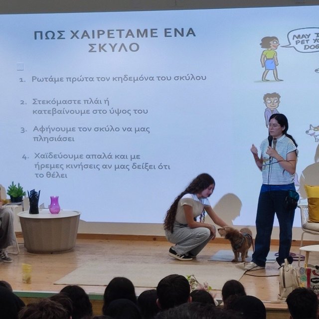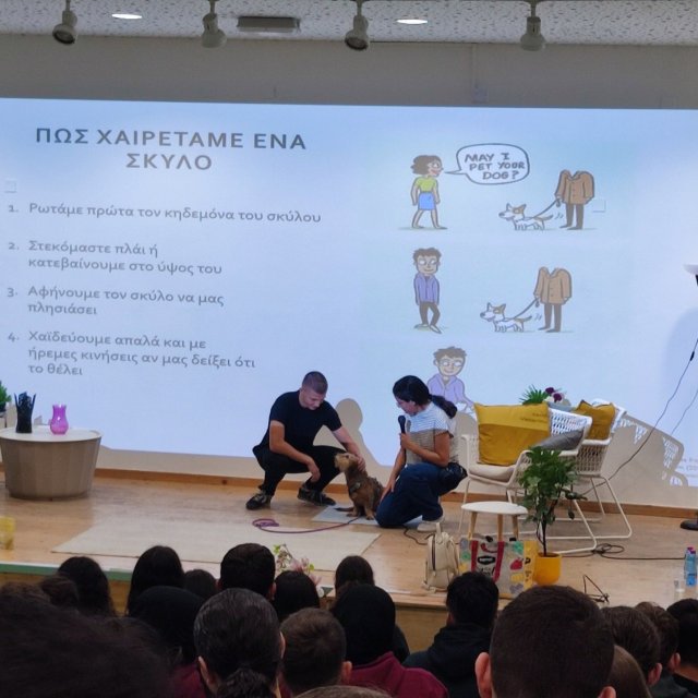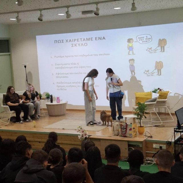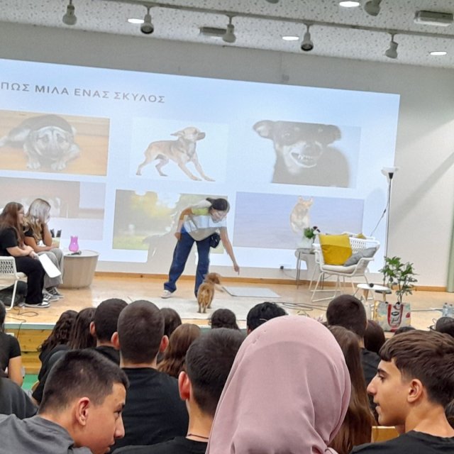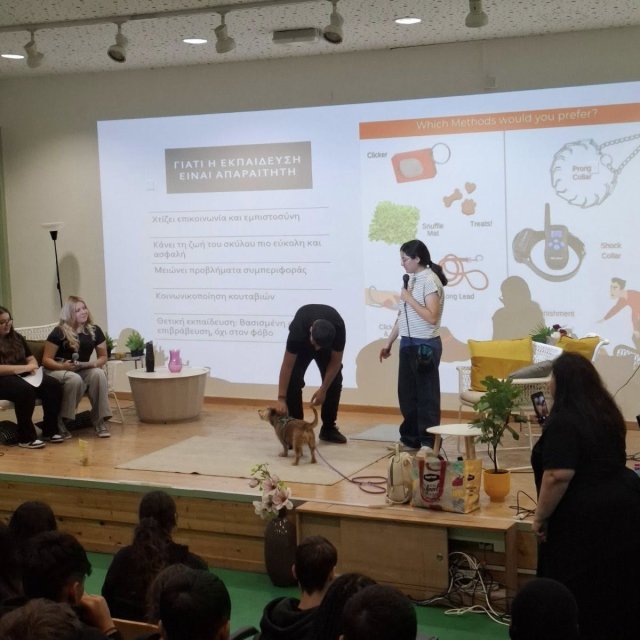 Εβδομάδα Αφιερωμένη στην Ευημερία των σκύλων και στον Εθελοντισμό διοργάνωσε το σχολείο μας. Την Τετάρτη, 8/10/2025 πραγματοποιήθηκε στη διάρκεια των διαλειμμάτων η δράση Meet the Teachers’ Pets & Bring my Pet to School. Υπεύθυνη της δράσης ήταν η Β.Δ. Α΄ Πέπη Μιχαηλίδου. Μαθητές, μαθήτριες και εκπαιδευτικοί έφεραν τα κατοικίδιά τους και μοιράστηκαν ιστορίες μεταξύ τους. Την Παρασκευή, 10 Οκτ. 2025, φιλοξενήθηκε στο σχολείο μας η Δρ. Χριστιάνα Νικολάου, πιστοποιημένη συμπεριφεριολόγος σκύλων σε μια διαδραστική παρουσίαση με τη συνεργασία της πιστής της βοηθού, της Μίνας. Η δράση απευθυνόταν σε όλους τους μαθητές και τις μαθήτριες της Α΄ τάξης και είχε στόχο την ενημέρωση, τον προβληματισμό και την ευαισθητοποίησή τους σε θέματα εγκατάλειψης και κακοποίησης σκύλων, υπεύθυνης ιδιοκτησίας και μεταχείρισης, βασικών αρχών επικοινωνίας και, γενικότερα, του τρόπου με τον οποίο χτίζεται μια σχέση σεβασμού και ευθύνης με τα ζώα.
