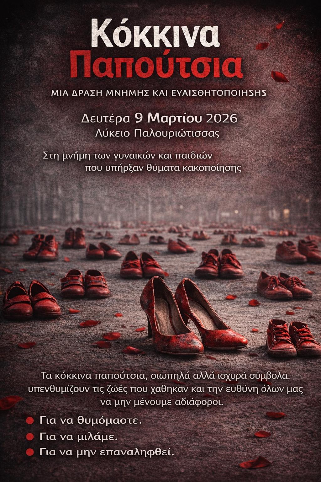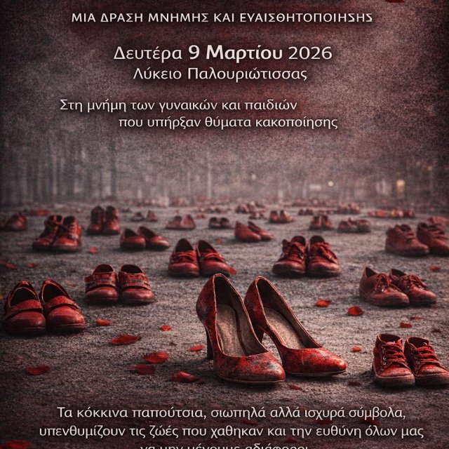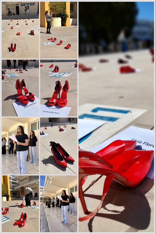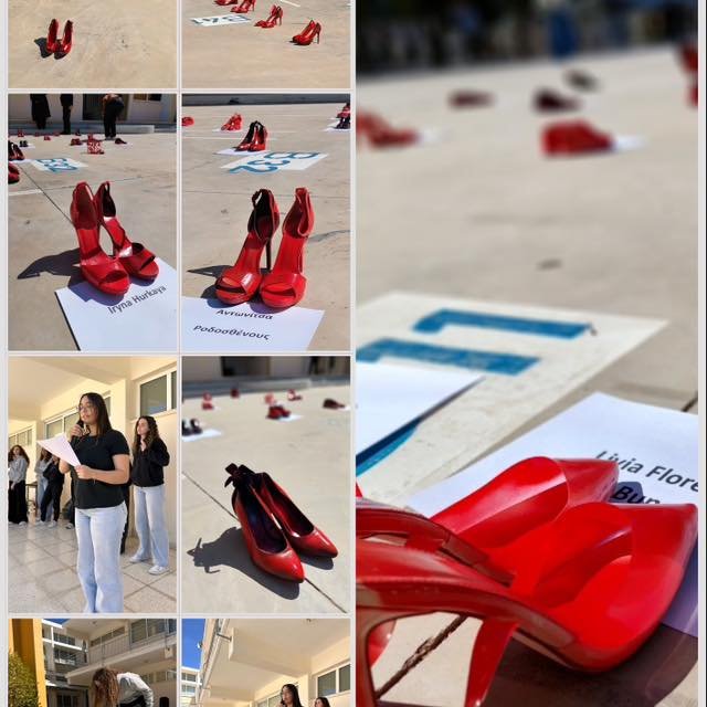 Τη Δευτέρα, 9 Φεβρουαρίου, στην αυλή του σχολείου, δεκάδες κόκκινα παπούτσια τοποθετήθηκαν στο έδαφος. Κάθε ζευγάρι και μια ιστορία. Μια σιωπηλή εγκατάσταση μνήμης για τις γυναίκες της Κύπρου που δολοφονήθηκαν, για τις κακοποιημένες που δεν πρόλαβαν να ακουστούν, για τα παιδιά που χάθηκαν μαζί τους ή έμειναν πίσω να κουβαλούν το τραύμα. Μαθήτριες του σχολείου διάβασαν τα ονόματά τους. Υπεύθυνη της δράσης ήταν η Μαθηματικός Κάλλη Χριστοφόρου